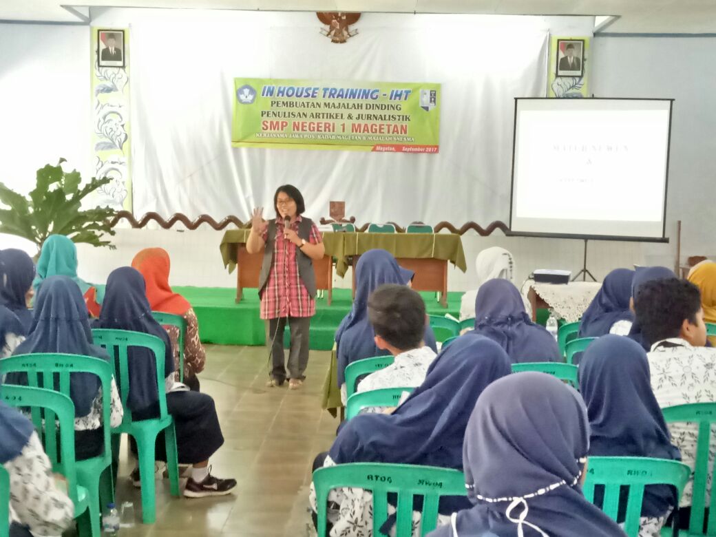 In House Training Jurnalistik dari Radar Madiun, pada bulan september 2017. Perlunya siswa SMP Negeri 1 Magetan dalam mendalami jurnalistik, khususnya jurnalistik media (koran, majalah) akan membawa dampak positif. Salah satunya adalah ketrampilan mereka di dalam mengelola majalah dinding dan majalah sekolah. Dengan memiliki keterampilan di dalam mengelola majalah dinding dan majalah sekolah, maka siswa akan semakin terasah potensi yang ada dalam dirinya dalam menuangkan gagasan secara komprehensif