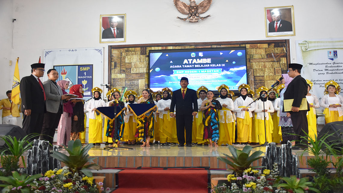 Kegiatan Acara Tamat Belajar Siswa dan siswi di SMPN 1 Magetan dilaksanakan pada hari selasa, 28 Mei 2024 dengan mengambil tema ” Bersatu dalam perbedaan dan menembus batas prestasi dalam Kurikulum Merdeka “. Kegiatan diikuti oleh seluruh peserta didik kelas IX dan Orangtua/ Wali Murid, Bapak Ibu Guru, dan seluruh tamu undangan.